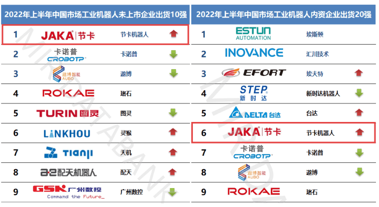 根據MIR睿工業統計,2022年上半年大陸工業機器人出貨量超過13萬台,並依照各工業機器人的廠商出貨量評選出2022年上半年大陸工業機器人出貨前20強,《節卡為協作機器人排名第一》,以大陸工業機器人排名來看,也有第六名的好成績。