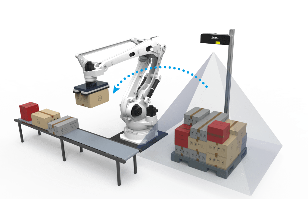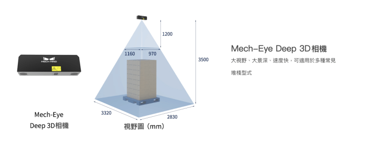 工業級 3D 相機,精度高、大視野,可處理多種不同常見堆棧型式(如 1.2 m × 1.2 m × 1.8 m 尺寸的棧板)。