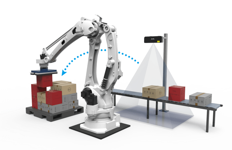 - 採用梅卡曼德工業級 3D 相機,快速、高精度測量紙箱尺寸,可實現任意來箱規格、來箱順序的混合堆棧