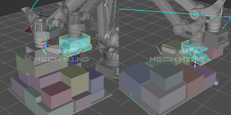 Mech-Viz實際操作界面圖(卸棧應用),下圖左側界面一鍵模擬,可直接看到機器人的運動路徑、箱子的識別效果及碰撞模型;右側為機器人操作流程,簡單易學。