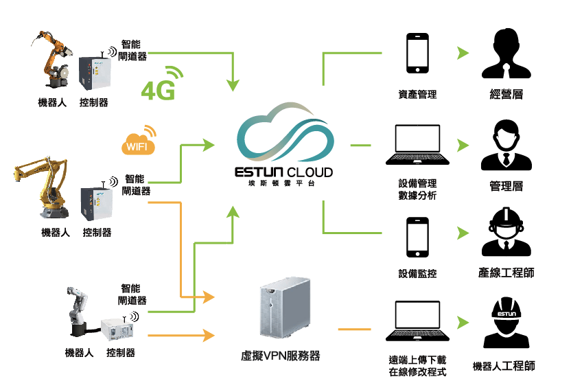 Estun Cloud透過無線遠端連接模組將機器人連接到雲端,可透過APP即時監測機器人的運作狀態和報警故障訊息,透過PC端軟體可遠端對機器人進行程式修改及下載,對機器人的故障進行遠端診斷。縮短和優化故障的處理時間和溝通成本,提高服務質量,透過大數據分析挖掘商業潛力。支援通用通訊協議,可將更多自動化設備接入雲端,實現自動化與資訊化融合,為工業4.0提供技術支持。