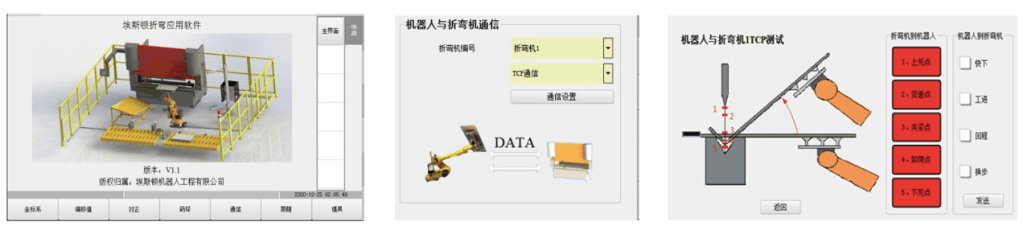 支援與折床系統的 I/O 和 Ethernet 兩種通信方式,網路通訊模式僅需一根網線連接,無需繁瑣接線,可實現讀取折床信號、模具參數、折床速度等參數,直接使用教導盒調試折床指令,控制折床啟動。軟體套件對機器人和折床的擺放沒有特殊要求,方便用戶在有限的空間內靈活佈局,且更換模具後無需重新標定折床,操作便捷。具有針對折床應用的簡單堆棧功能,方便用戶使用。高精度位移傳感器實現自動送料功能,大量節約教導時間,並保證折床精度。