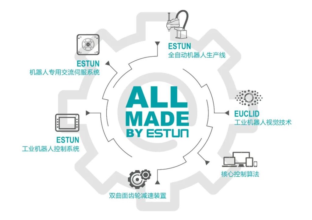 埃斯頓機器人建構了完整機器人產業生態鏈,核心零件領域包含:機器人控制系統、伺服系統、機器人本體製造,埃斯頓率先實現80%以上的自主化研發和生產。
