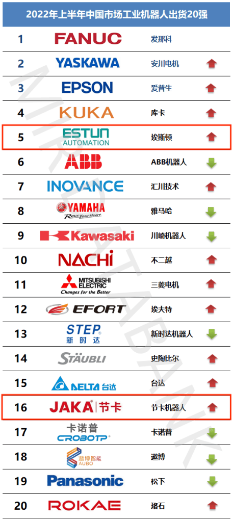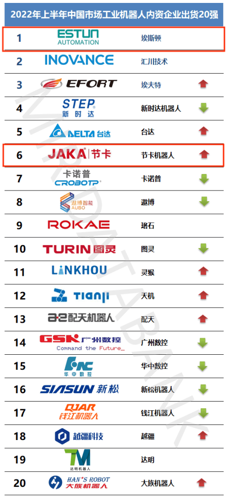 以全球工業機器人品牌來看,2022年上半年出貨量《埃斯頓工業機器人》全球排名第5 /《節卡協作機器人》全球排名第16