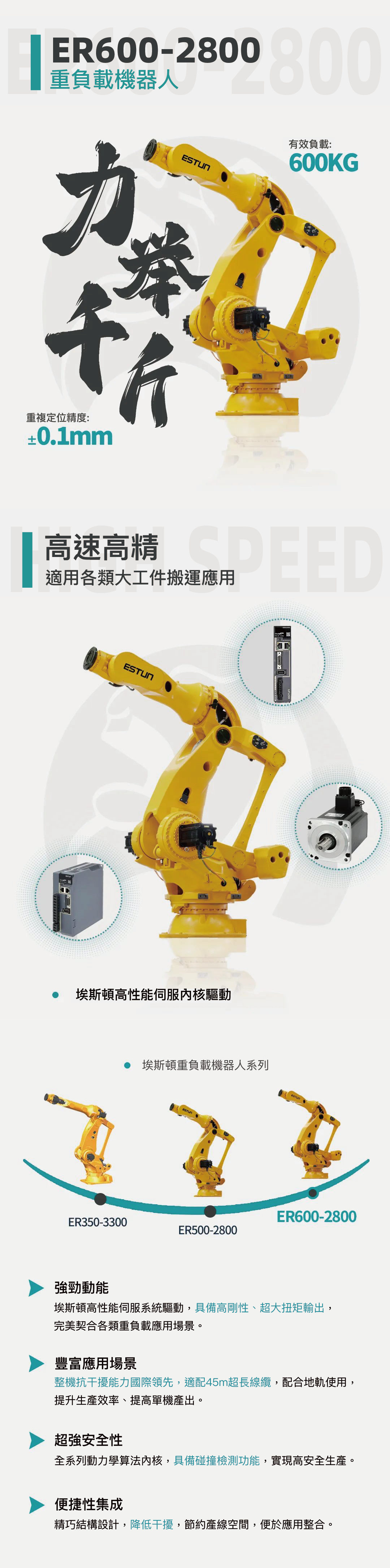 ER600-2800擁有600kg的有效荷重及2800mm臂展, 基於埃斯頓自主化核心部件及控制系統,內核為動力學模型的控制算法,速度和精度性能全面提升,重複定位精度±0.1mm,整機防護等級IP54,可適應多種複雜的作業環境。在鋰電池、汽車、金屬加工、建材等行業具有廣泛的應用,解決高慣量、高質量的重型工件搬運及加工場景。