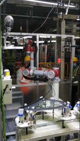 在搬運環節,由於周邊干涉機構多、放料位空間特別小,機器人需要能夠靈活調整姿態,且不能大幅度移動。同時,機器人要在自身體積較小的情況下,負載角窗、抓具、線纜等物體重量。