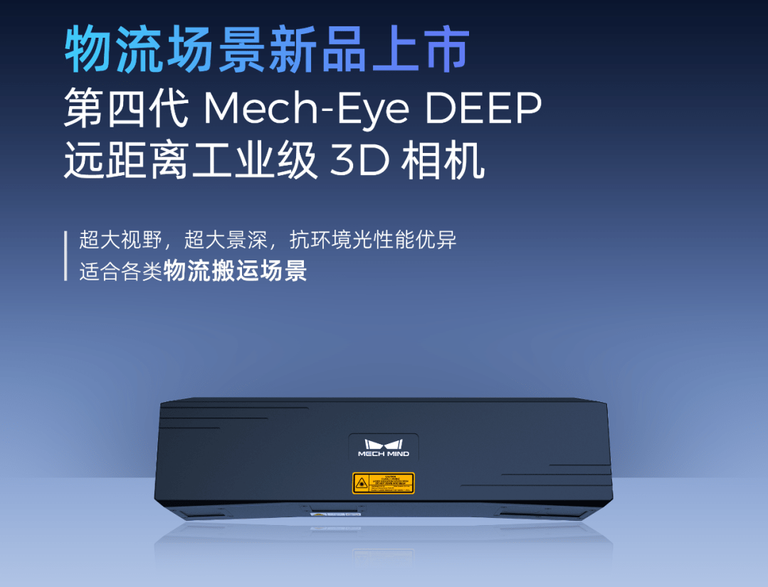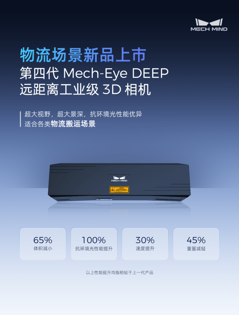 梅卡曼德正式發布全新第四代Mech-Eye DEEP遠距離工業級3D相機。 Mech-Eye DEEP是梅卡曼德針對各類物流搬運場景而推出的旗艦款3D相機。相較於上一代產品,Mech-Eye DEEP抗環境光性能提升100%、速度提升30%、體積減小65%、重量減輕45%,並具備超大視野、超大景深、高精度等優勢。