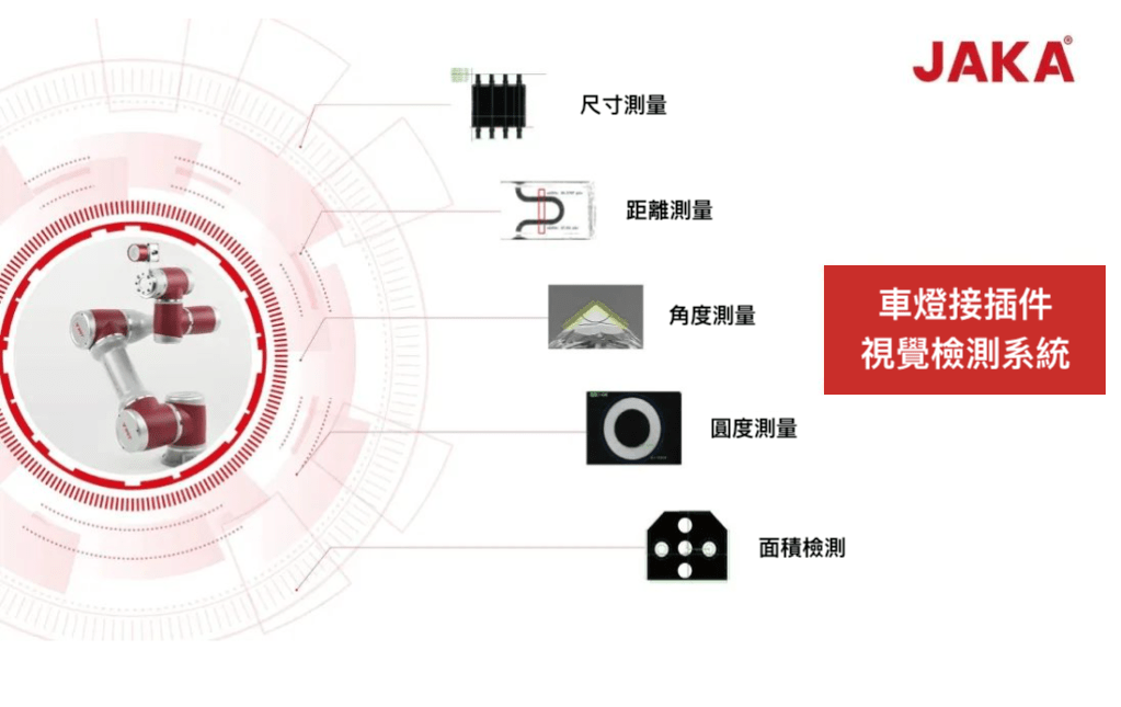 JAKA車燈接插件視覺檢測系統具備尺寸測量、角度測量、距離測量、圓度測量、面積檢測等功能,可應用於電子元器件、汽車零件、手機零件、螺絲螺母、五金零件、磁性材料、塑膠、陶瓷、鈕扣等複合材料構件,鎂、鋁及其合金件等場景。