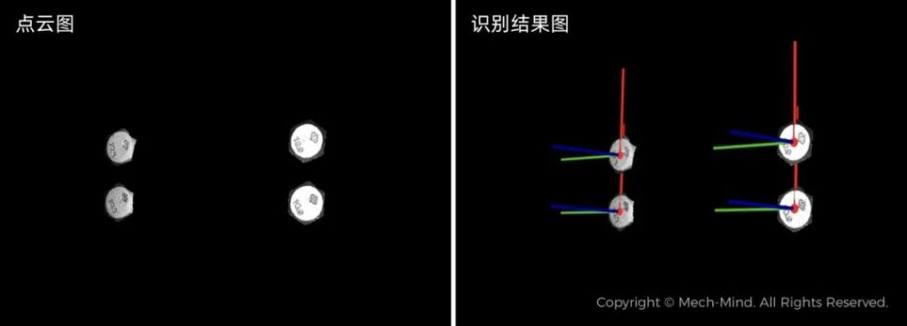 - 現場採用了高精度結構光3D相機Mech-Eye PRO M,該相機採用了先進的光學器件,可滿足現場毫米級定位精度要求。能夠對現場存在較強環境光干擾的情況下,對錶面反光、帶有划痕、油污的螺栓生成邊緣清晰、細節完整的高質量點雲。