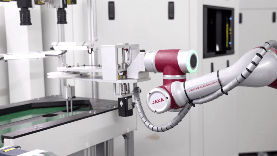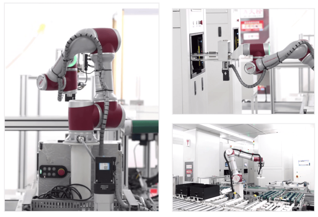 其中,節卡小助系列協作機器人結合外部軸擴展運動範圍,一台機器人對應多台倉儲機,生產效率高;具備碰撞保護功能,避免物料被撞壞;