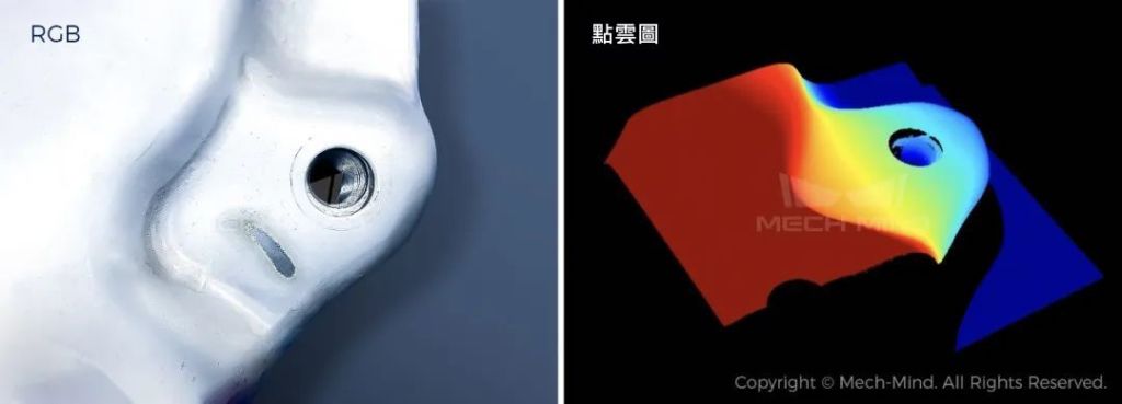 車身、零件、分總成生產過程中需要對數百上千的孔、邊、面、螺柱等進行高精度測量,以確保車身組裝精度。 CMM為接觸式測量,易損傷工件、無法100%測量全部特徵、測量耗時長等問題,因此「機器人+光學感測器」的非接觸彈性測量成為了更優的選擇。工件進入測量工位後,機器人搭配Mech-Eye UHP-140靈活運動至待測點上方,高速掃描待測點產生高品質3D點雲影像。 Mech-Eye UHP-140採用了自研融合成像演算法、抗反光演算法等先進3D成像演算法,輕鬆應對變形、反光、盲點對光學成像造成的干擾。