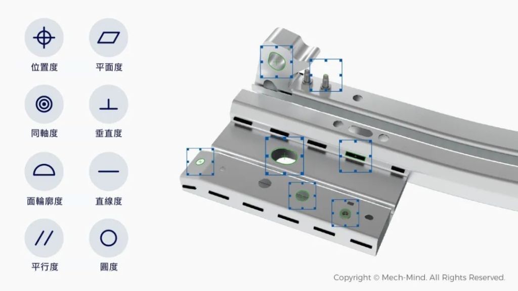 Mech-Vision機器視覺軟體取得待測點3D資訊後,基於內建測量演算法計算待測特徵在工件/車身座標系下的3D座標,進一步計算輸出幾何尺寸或形位公差。最終實現與CMM對標偏差在±0.2mm以內的高精度測量。