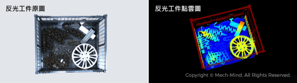 Mech-Eye LSR L選用反光物體模式,大幅提升反光物體成像質量,點雲準確度提升90%(相較於傳統模式)。