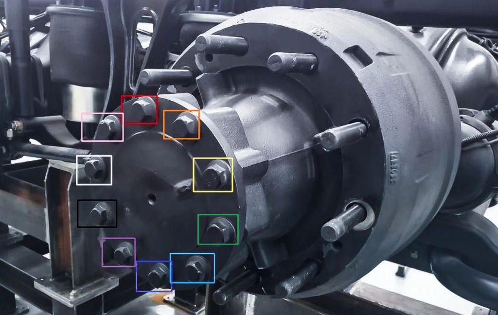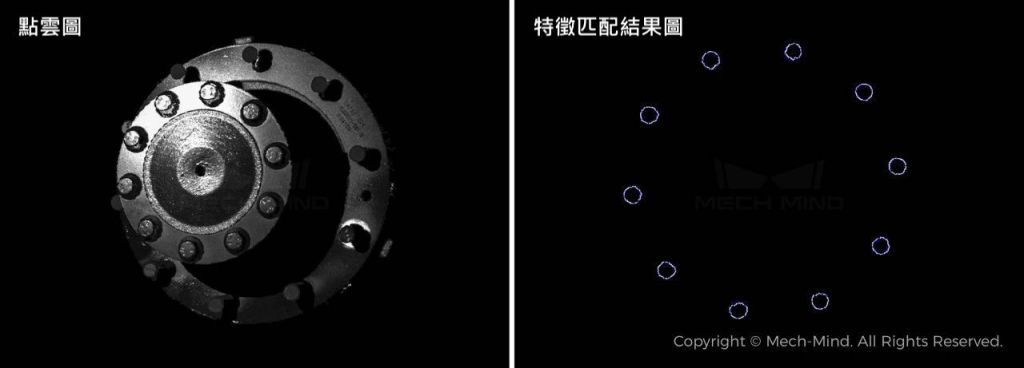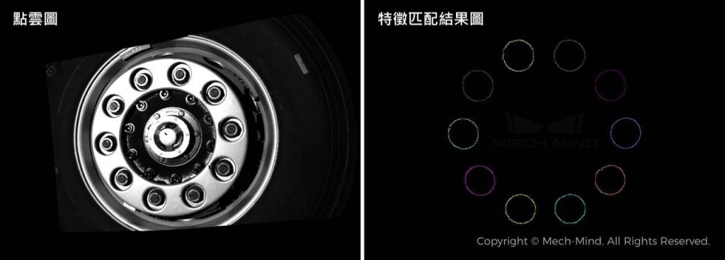 透過先進的成像技術,Mech-Eye PRO S-THR對黑亮反光的輪圈也能高品質成像,精確提取輪圈的邊緣、螺栓及凹槽的輪廓線,產生輪廓清晰、細節完整的3D點雲。 Mech-Vision取得3D相機產生的點雲後,即時計算產生輪圈的空間位姿座標,引導機器人將輪胎精準裝入輪圈。隨後,透過對螺柱的高精度定位,完成前後軸輪胎組裝。