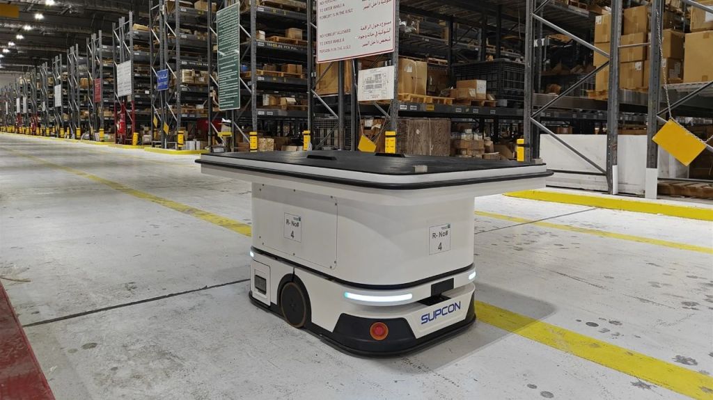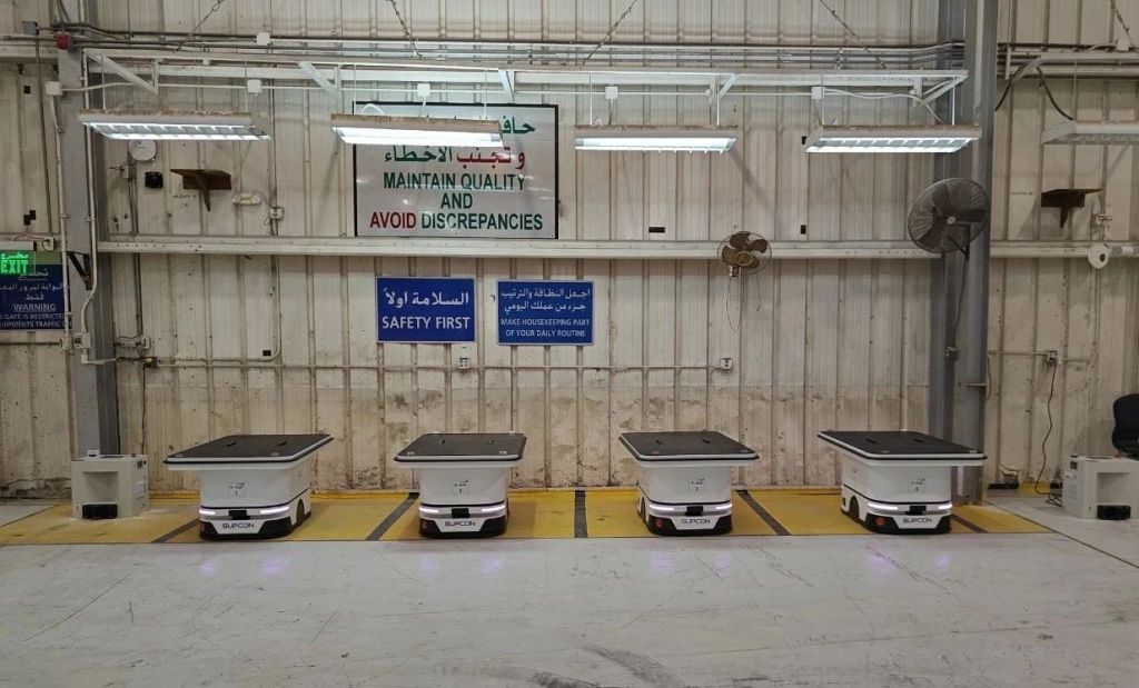 數台迦智科技室內工業級自主導航搬運機器人EMMA600K,目前部署於沙烏地阿美公司總部的廠內倉庫。