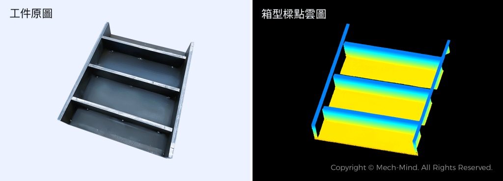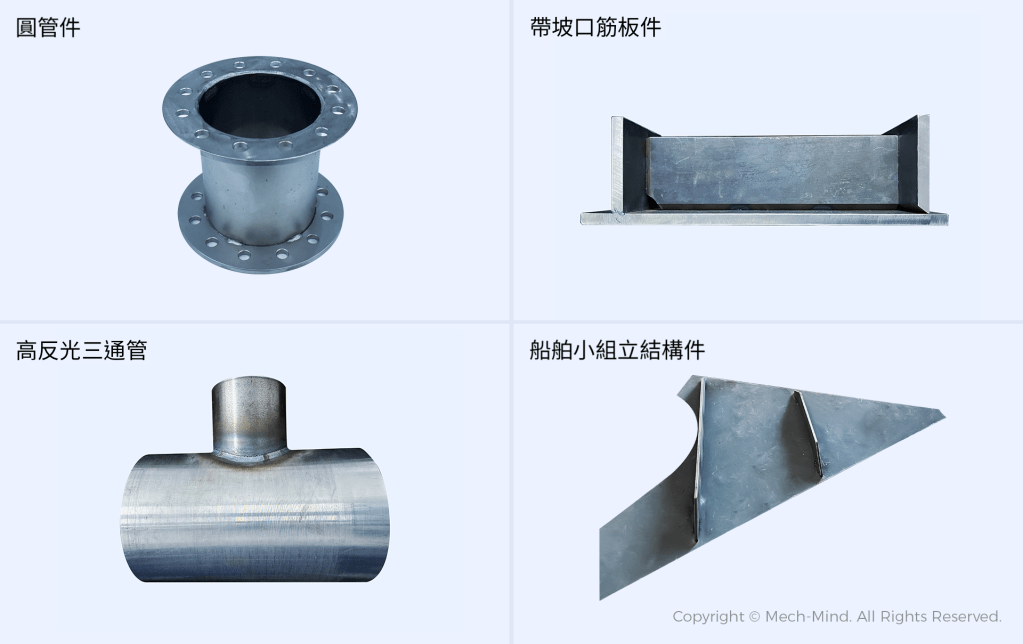 Mech-Eye Welding採用了高亮度DLP投影機、高解析度CMOS感測器,能夠適應不同材質、不同反射特性的焊接件,對於高亮反光、暗色、溶渣、鏽跡的焊接件和坡口,也能捕捉足夠的條紋訊號,產生高品質3D點雲數據。針對焊接件角接、搭接、對接等接合方式,Mech-Eye Welding基於其自研的雙眼結構光成像演算法,精確捕捉待焊位置的三維資訊。清晰、細緻的呈現焊接件接合位置的3D數據,更能確保焊接製程執行品質。