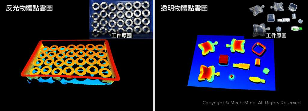 有效應對高亮反光、鏡面反光、筐壁反光等情況,大幅提升複雜工況下對各類反光物體的辨識成功率;有效應對折射、透射等問題,可對鹽水袋、玻璃盒等常見透明物體高品質成像。