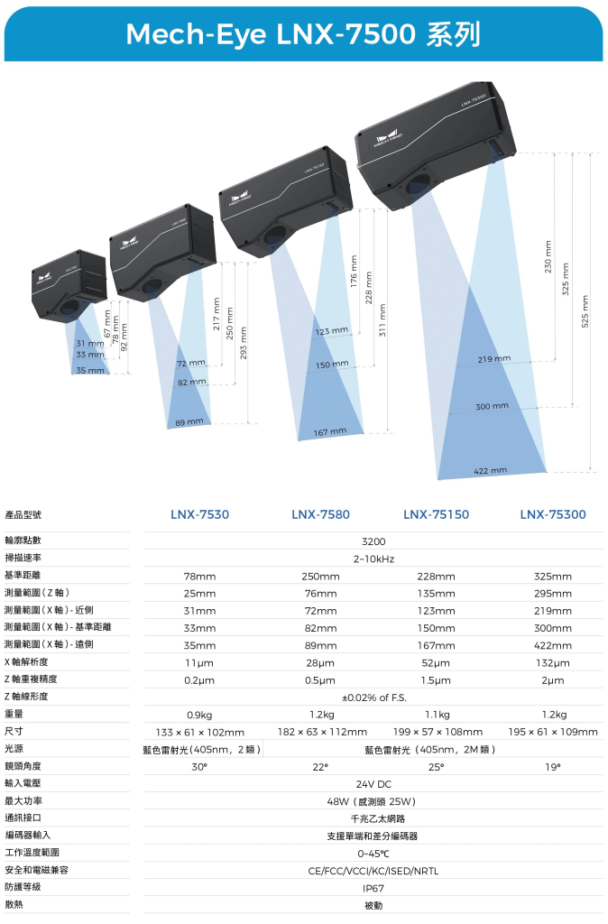 全新推出Mech-Eye LNX-7500系列,超高X軸解析度、超快速掃描速率,能夠快速捕捉物體表面輪廓及細微特徵。