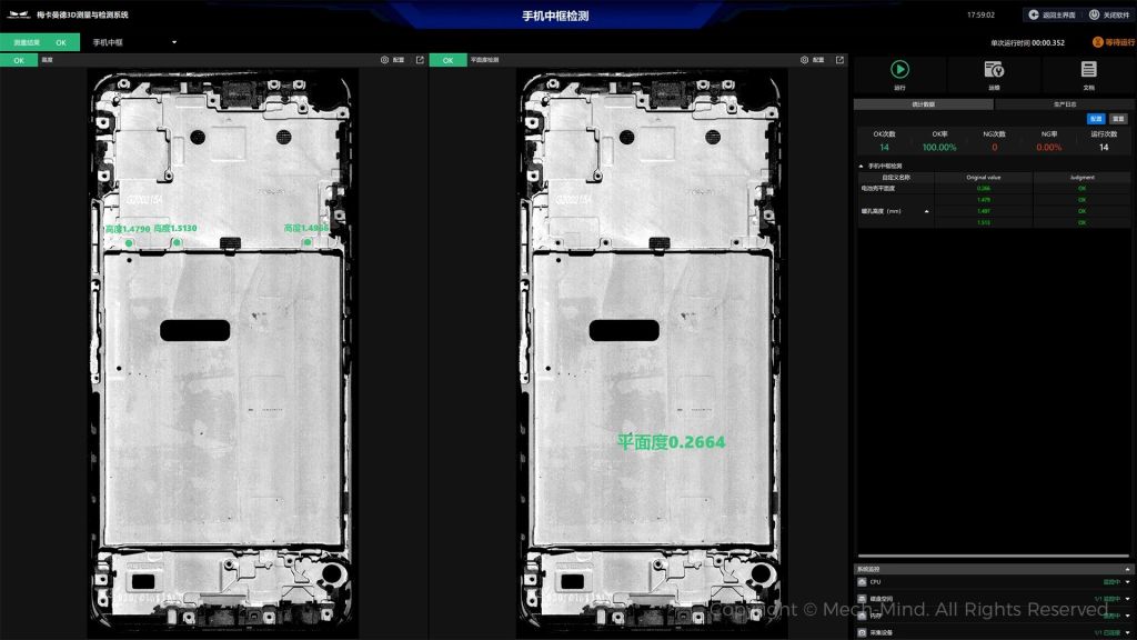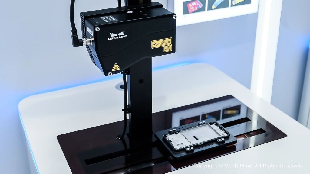 手機外框平面度/段差測量:Mech-Eye LNX-8080,4K超高解析度,能夠對霧面、油污、高亮反光的手機外框高品質成像。重複測量精準度<0.015mm,視覺工程節拍<0.5s,關鍵技術指標高於業界標準。
