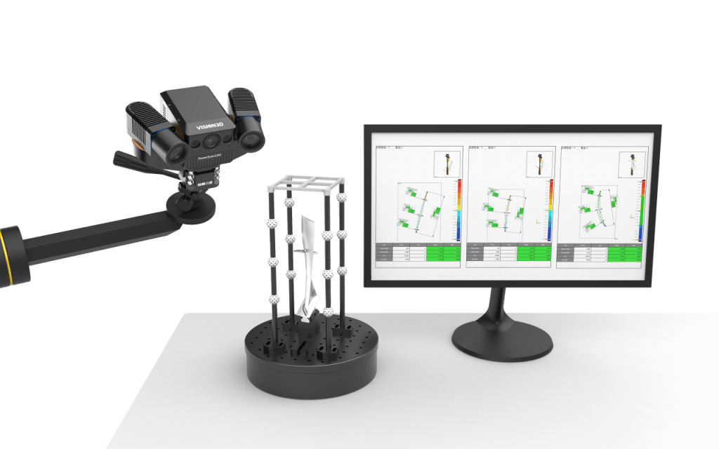 高精度作業能力:間隙面差尺寸極小,間隙差通常要求亞毫米級精度。節卡機器人重複定位精度可達±0.02mm,作業穩定性強。搭載惟景三維的3D相機,採用獨有的傾斜偏轉校正算法,並配合高性能處理器,能夠覆蓋尺寸範圍從10nm到5000mm的零件測量需求。掃描儀單幅測量時間可達0.6秒/幅,零件整體測量精度優於±0.15mm。