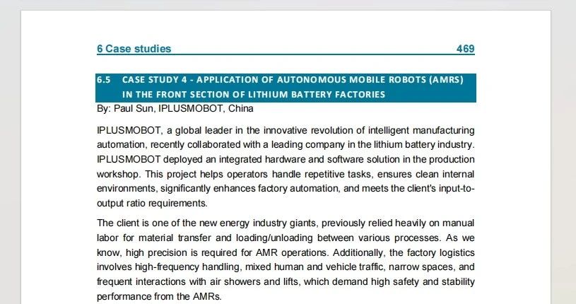 近日,機器人產業權威機構——國際機器人聯合會(International Federation of Robotics,簡稱IFR)發布了最新的《2024世界機器人報告》。迦智科技在新能源鋰電池智造工廠的物流智能化轉型升級應用,已被納入《2024世界機器人報告》典型應用案例研究。