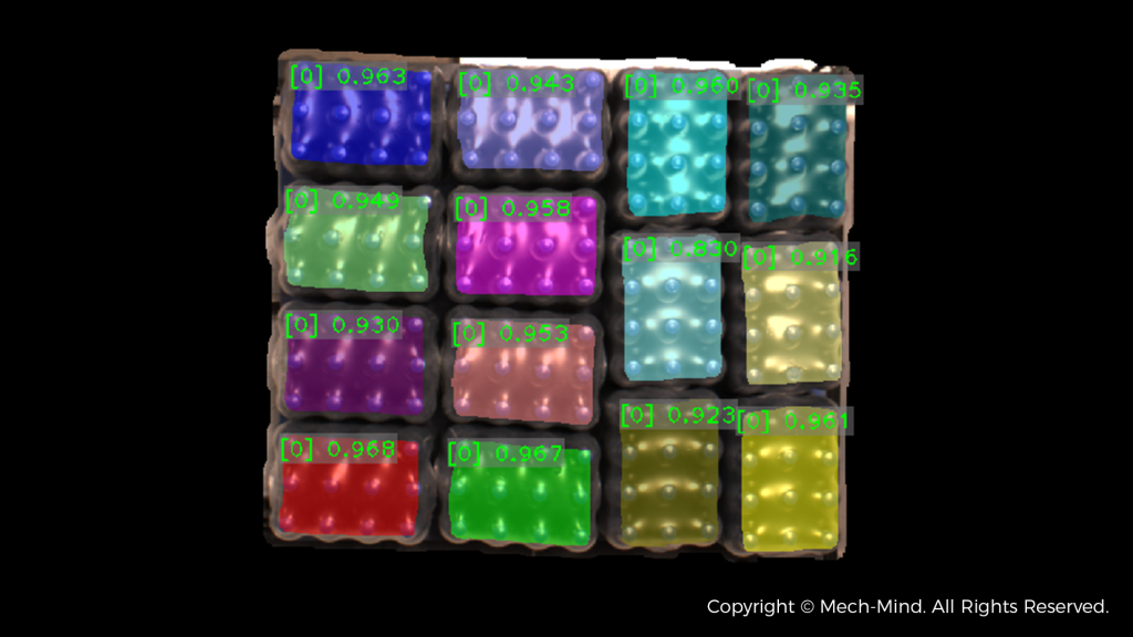 Mech-Vision機器視覺軟體接收來自Mech-Eye DEEP生成的3D點雲數據後,計算並生成膜包的精確位姿。該軟體內建先進的AI算法,能處理緊密貼合、褶皺、變形等複雜工況,並識別紙箱的長短邊,便於規劃最佳抓取方式。透過即時數據處理,Mech-Vision確保在高速物流環境中也能提供穩定可靠的位姿信息,極大提升了機器人卸棧和搬運的效率與準確性。