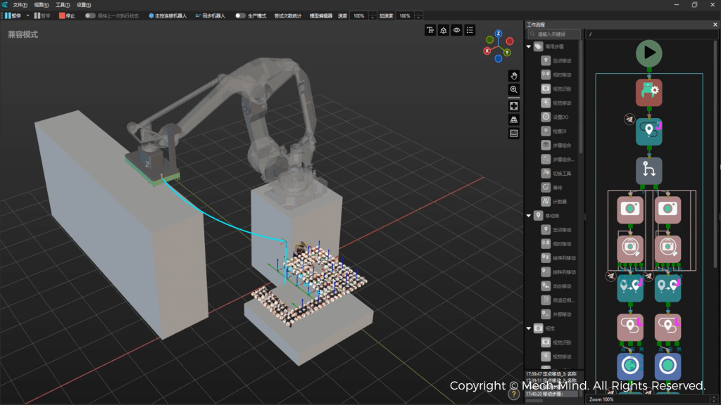 在獲取到最上層待拆物體位姿信息後,Mech-Viz機器人軟體會依次進行抓取規劃、碰撞檢測、機器人運動路徑規劃。該軟體內建智能抓取算法,根據Mech-Vision識別到的紙箱長邊和短邊,合理規劃最優抓取順序及數量,確保每次抓取最多的同方向膜包或紙箱,極大提升卸棧效率。