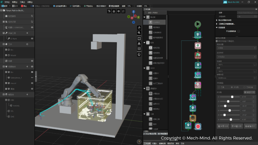 Mech-Viz 讓用戶無需編程經驗即可實現機器人編程,採用圖形化可視化界面,支援一鍵模擬機器人運動過程。借助新升級的路徑規劃和碰撞檢測等 AI 演算法,最大程度優化機器人運動路徑,提前預測並避免潛在碰撞,提升了系統的穩定性和安全性。此外,軟體內建智能抓取規劃演算法,支援多抓取點和多 TCP 功能,從而輕鬆應對深籃抓取、紙箱卸棧、多抓堆棧等複雜場景。