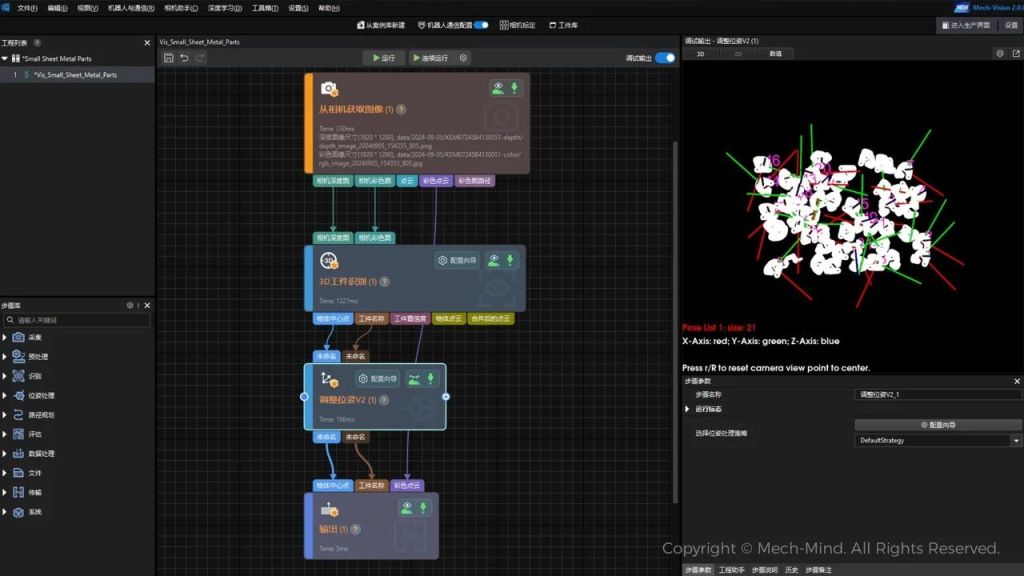 Mech-Vision 升級了 AI 演算法,能夠更好地應對無序堆疊、高亮反光、深色異形、緊密貼合和海量 SKU 等複雜場景。新增的快速標定、3D 工件識別和位姿調整等可視化調試工具,大幅減少調試步驟和周期。此外,軟體內建了應用模板、教學範例和典型案例,為用戶提供全面且實用的技術支援,助力視覺應用的快速部署。