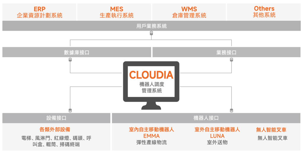 CLOUDIA(Cloud based Industrial Autonomy)強大的機器人智能調度管理系統,透過後台集中監控, 能夠實現多機器人的任務指派、調度協同與交通管制,提供接口與客戶現有的WMS、MES、ERP系統無縫對接。