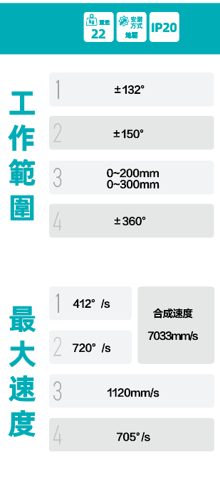 荷重: 10kg 臂長: 500mm 重覆精度: J1+J2 : ± 0.02mm J3 : ± 0.01mm J4 : ± 0.01° 本體重量: 22kg ER10-500-SR 運動空間包絡圖下載